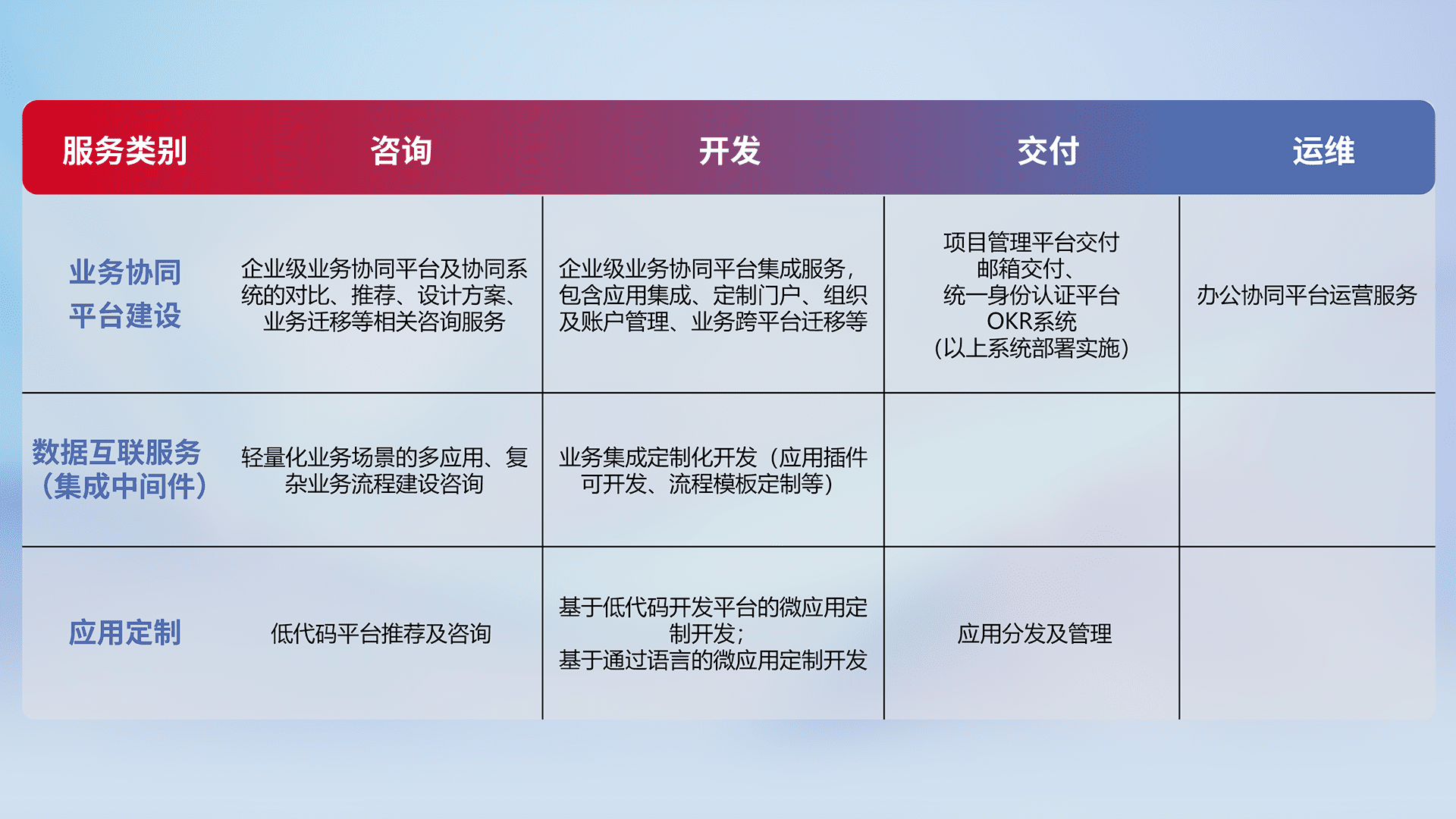 针对钉钉、、、企微、、IDaas等平台级产品提供产品的规划、、、方案、、、、交付、、、、定制化开发等服务,,,实现如统一协同办公、、、智能客户服务、、混合会议管理、、、、智能数据查询、、、等业务场景,,,,实现数字化转型。。。