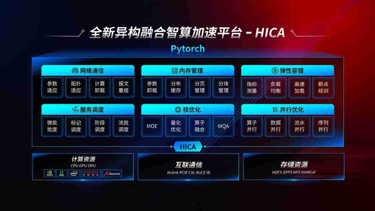通过自研的服务层、、、中间适配层、、、、以及调度编排算法,,,,采用数据并行、、、、模型并行等多种并行方式,,把并行计算任务进行有效的分解,,使其分别由相应的软件栈和算力资源来承接。。。。当GPU资源变化,,,,HICA可以实时动态调度计算子任务并调整模型拓扑和架构,,以充分聚合各种算力资源。。。