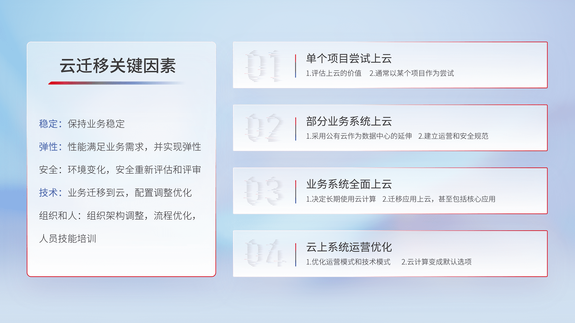 结合实际业务,,从规划设计、、、、云平台选型、、、云原生改造、、数据迁移、、集成交付,,,迁移全过程为客户识别最佳上云路径,,,做好风险识别管理,,,,设计网络架构、、身份权限、、、安全审计合规、、操作审计、、日志审计、、、监控告警策略、、、、多站点容灾设计等,,,对云上基础设施进行整体规划,,提升IT治理水平,,,,以满足弹性、、高可用、、、高性能的需求。。