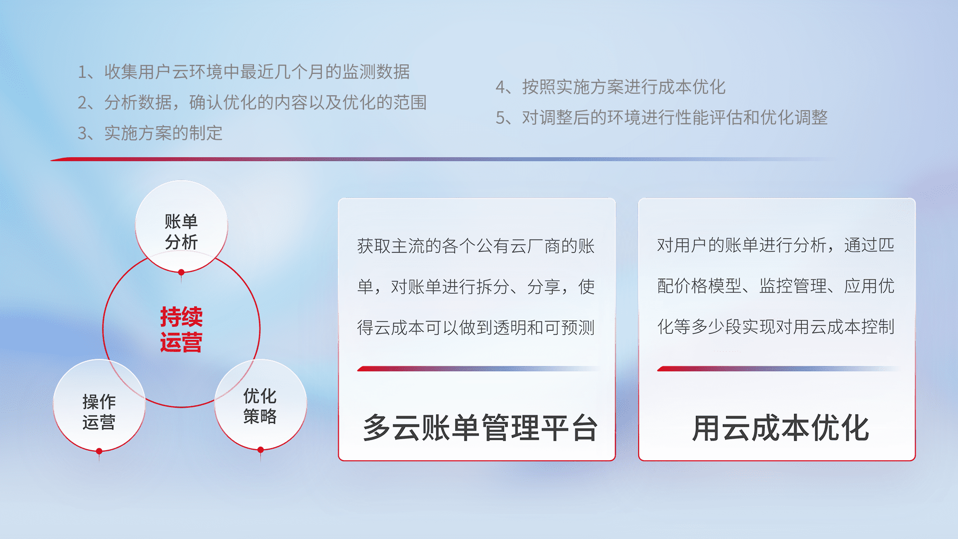 通过多云纳管,,,,以统一的资源数据模型把客户的云资源进行抽象和封装,,进而实现对多云资源的统一操作,,,保障云资源管理的可靠性、、、、稳定性与可用性。。。。量身定制化运维内容,,,,配置、、、、开发运维、、、、补丁管理、、备份、、监控、、、认证和访问管理、、、、审计和日常巡检等,,,保障在用云过程中的可靠度,,,稳定度以及高可用率。。。