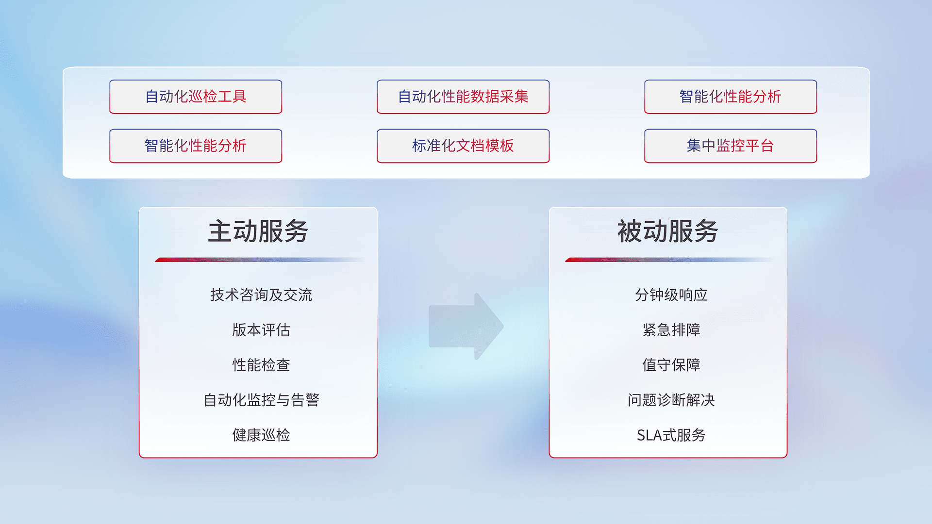 智能化工具和标准化文档,,保障服务质量,,提供主动服务(包含技术咨询、、、、版本评估、、性能检查、、、自动化监控与告警、、健康巡检)和被动服务包含(分钟级响应、、、紧急排障、、、、值守保障、、问题诊断解决、、、、SLA服务)。。。。
