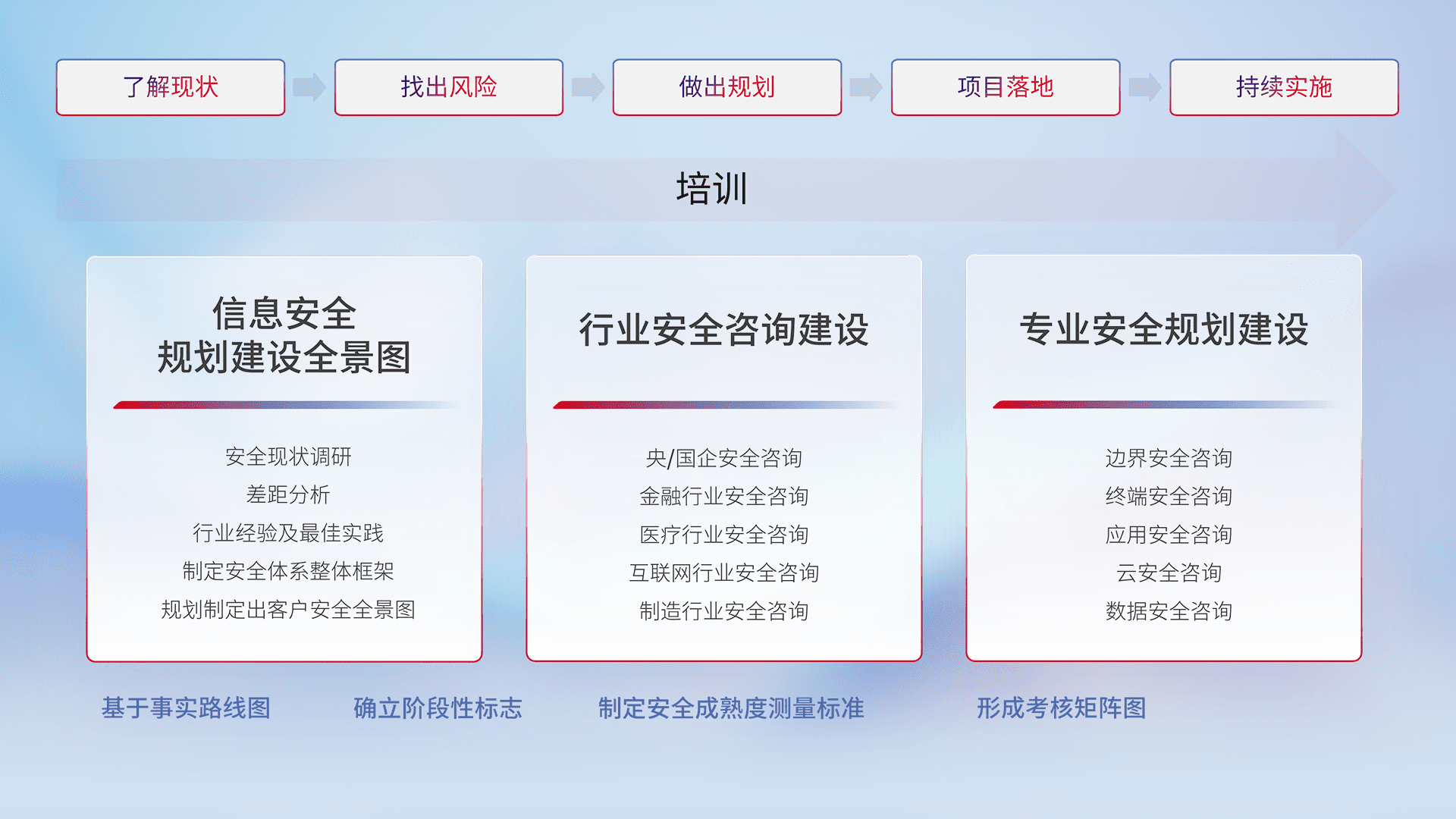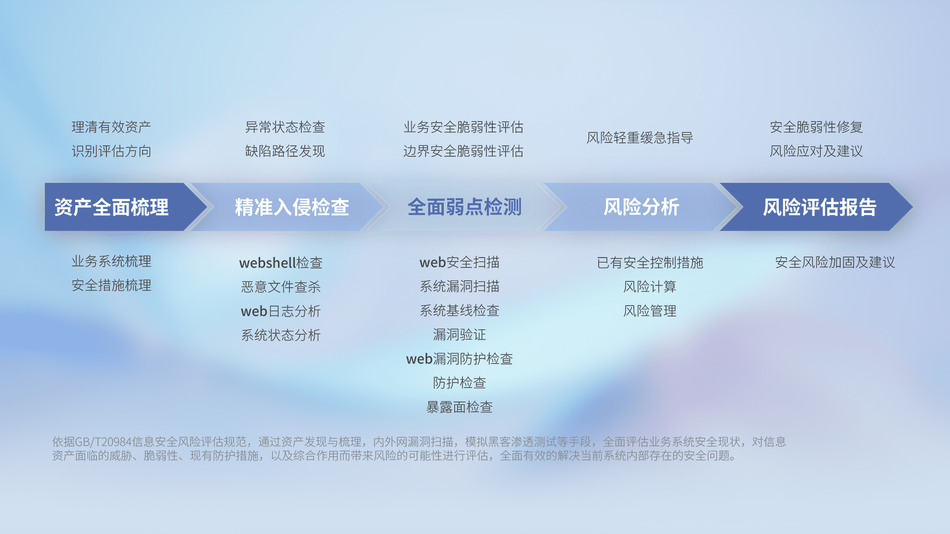 针对客户行业特性,,,,以专业的安全服务+多厂商联合解决方案提供专属的一站式安全管理服务,,帮助客户全面感知网络空间威胁,,基于识别、、、、检测、、分析、、、防护、、、、监测、、、、响应的服务理论模型,,,,从方案咨询、、、集成交付、、评估验证、、、优化加固、、、运维运营,,致力于为客户提供完整的闭环管理式安全服务。。。以实战经验为客户打造高抵御风险的安全体系,,,,帮助客户发现威胁、、、对抗威胁、、处置威胁,,,,不断积累安全对抗能力,,持续保障数字化安全。。。。